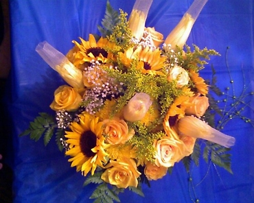 What a lovely array of monochromatic blooms, (here in yellow but available in color of your choice).Cheerful sunflowers, classic roses, bubbly spider mums, solidago, carnations and more all artfully arranged in contemporary cubed vase.
